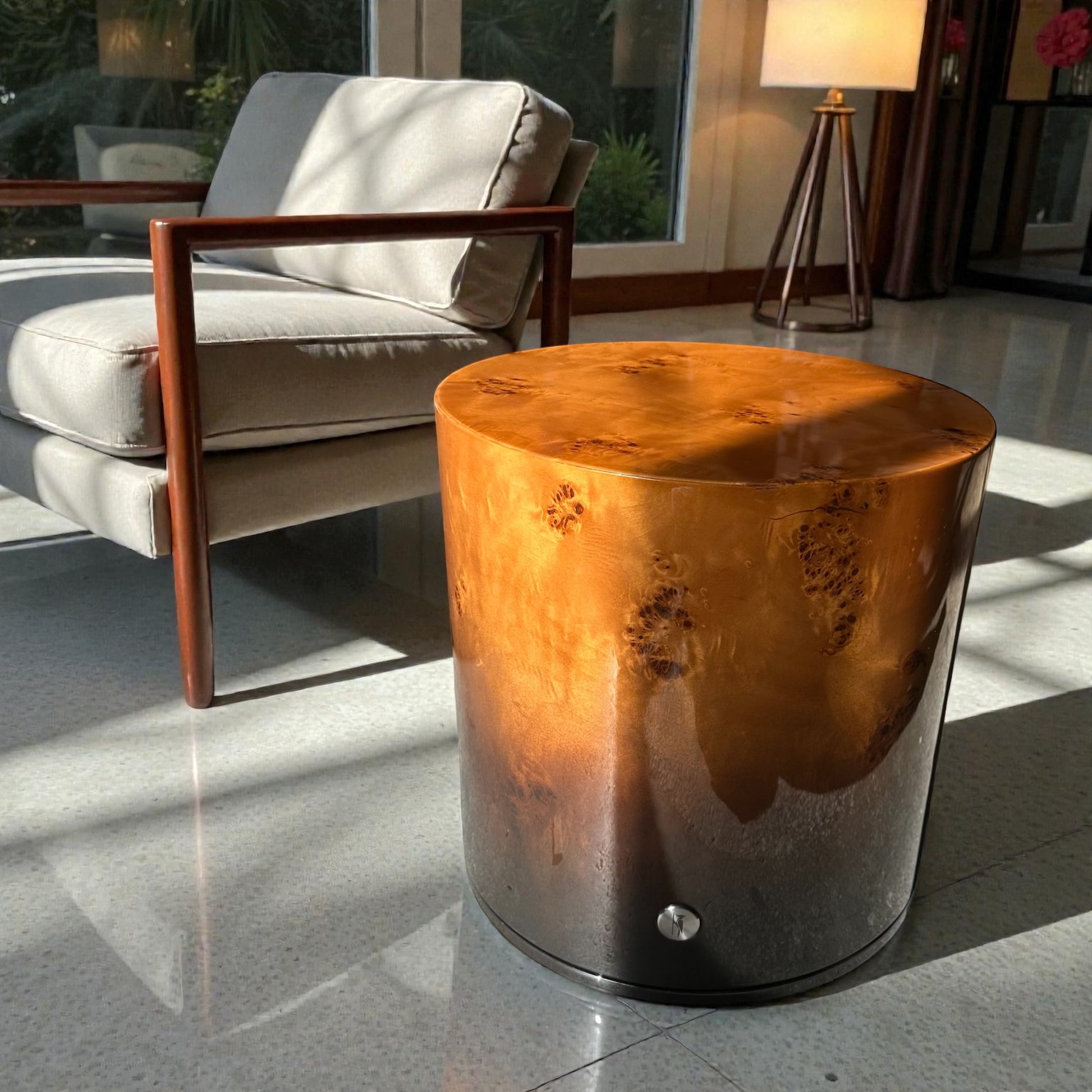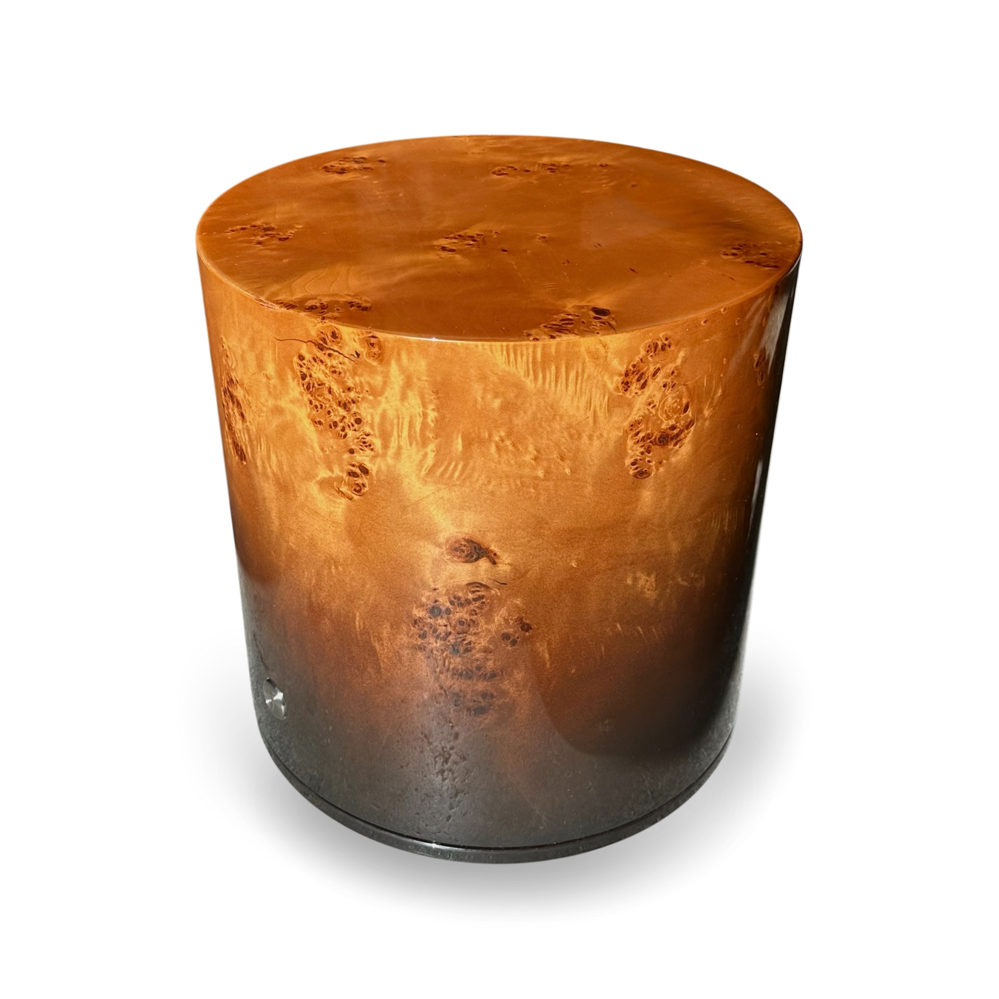 Özenle seçilmiş tek parça mazel kök kaplamalardan hassas el işçiliği ile üretilen bu ürün Marangoz Craft tarafından özel olarak tasarlanmıştır.Çelik civatalarla gövdeye bağlanan alt tablasına entegre edilen 360° hareket kabiliyetine sahip beş adet tekerlek, sehpanın kolayca yer değiştirmesini sağlar.Bu alt tabla temizlik esnasında gövdeyi deformasyonlara karşı korur.Kolaylıkla söküp takılabilen tabla, değişim veya onarım imkanı sunar.