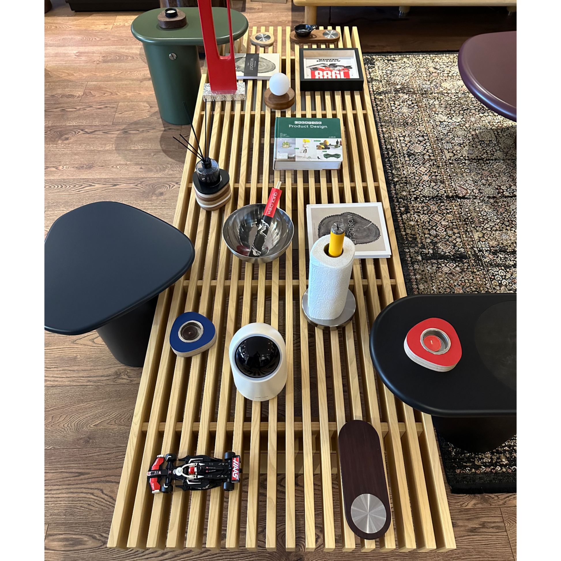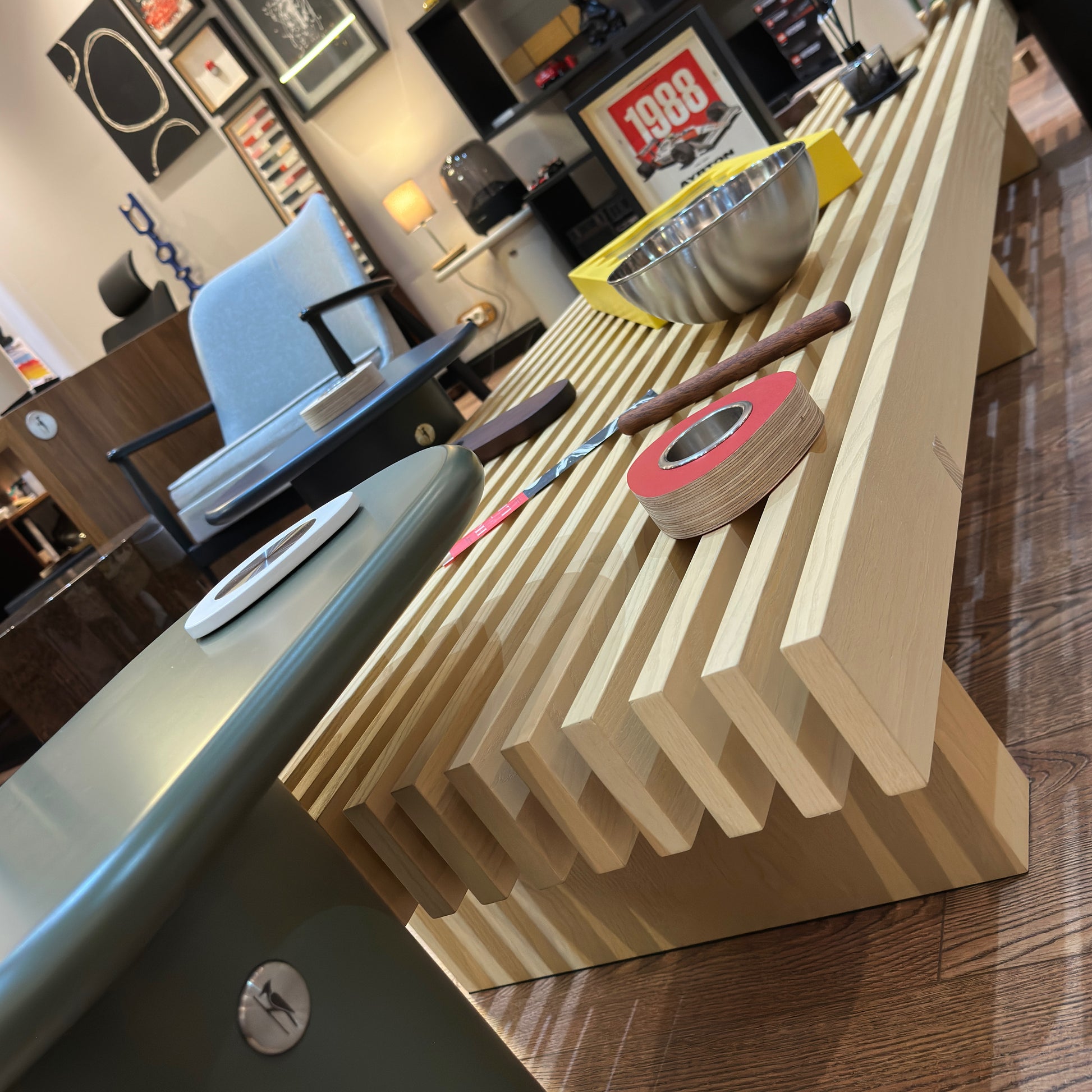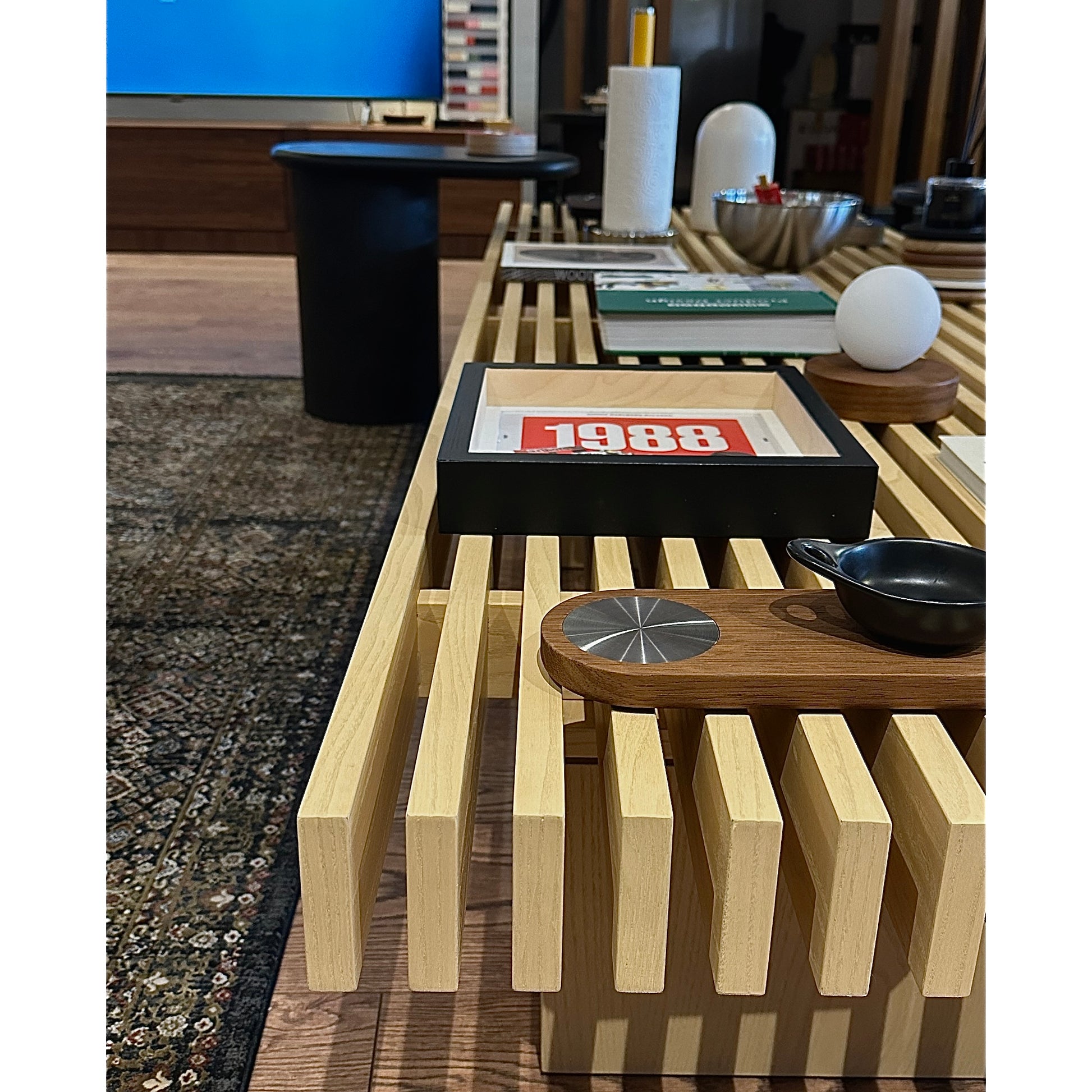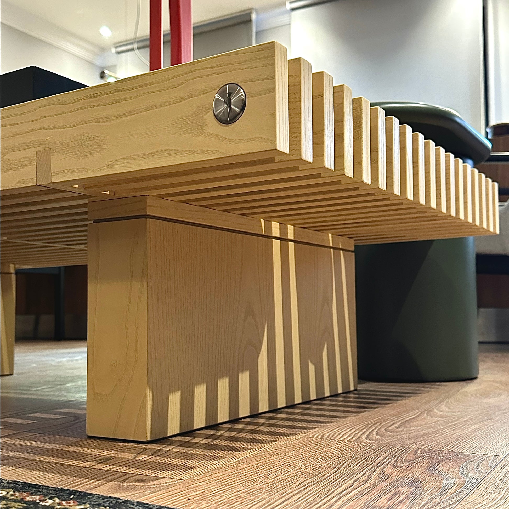 Marangoz Craft tasarafından tasarlanıp özenle seçilmiş doğal diş budak kaplama ve masif ahşaplardan el işçiliği ile üretilmiştir.Paralel ahşap şeritlerden oluşan üst tabla ve üç adet dikdörtgen ayaktan oluşur.Paslanmaz civatalar ile tablaya bağlanan ayaklar,rahatlıkla sökülüp kolay taşıma ve kurulum imkanı sunar.Tabanındaki EPDM kaplamalar,temas ettiği yüzeyi korur.